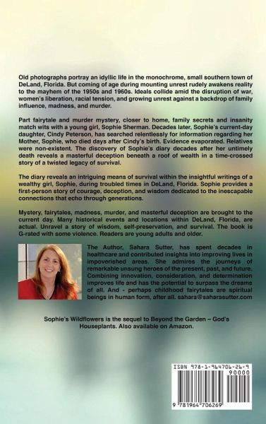 Part fairytale and murder mystery in the small town of Deland Florida from the 1950s to the 1960s. Ideals collide with the conflict and mayhem of the time as family secrets and insanity match wits with a young girl, Sophie Sherman. Decades later, Sophie's current day daughter, Cindy Peterson unexpectedly encounters the diary of her mother, who died days after Cindy's birth. The diary reveals a masterful deception beneath a roof of wealth within a time crossed story of a twisted legacy as inescapable connections echo through generations. Many historical events, locations, and situations within the story are actual. Sophies's Wildflowers is the sequel to Beyond the Garden - God's Houseplants
