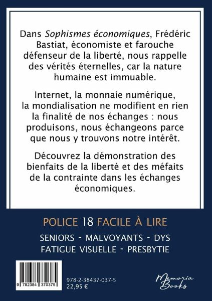 Découvrez « Sophismes économiques » , une démonstration des bienfaits de la liberté et des méfaits de la contrainte dans les échanges économiques. Édité pour la première fois en grands caractères et préfacé par Simone Wapler. Cette édition en grands caractères, avec un large interligne et une police facile à lire (Arial 18), est adaptée aux séniors, malvoyants, DYS, aux personnes souffrant de fatigue visuelle ou tout simplement de presbytie comme plus de 40 % de la population en Europe. Découvrez cette oeuvre de Frédéric Bastiat, économiste et farouche défenseur de la liberté qui nous rappelle des vérités éternelles, car la nature humaine est immuable. Internet, la monnaie numérique, la mondialisation ne modifient en rien la finalité de nos échanges : nous produisons, nous échangeons parce que nous y trouvons notre intérêt.