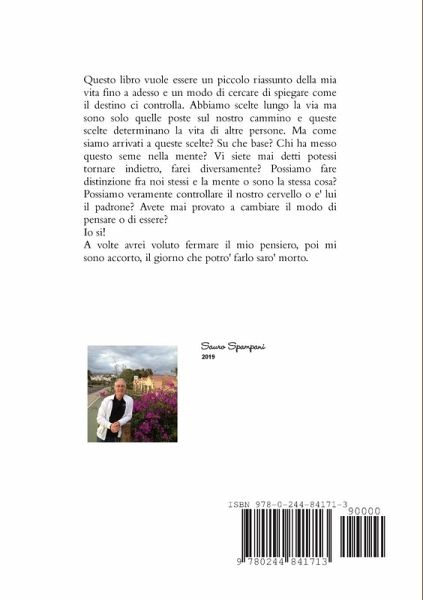 Questo libro vuole essere un piccolo riassunto della mia vita fino a adesso e un modo di cercare di spiegare come il destino ci controlla. Abbiamo scelte lungo la via ma sono solo quelle poste sul nostro cammino e queste scelte determinano la vita di altre persone. Ma come siamo arrivati a queste scelte? Su che base? Chi ha messo questo seme nella mente? Vi siete mai detti potessi tornare indietro, farei diversamente? Possiamo fare distinzione fra noi stessi e la mente o sono la stessa cosa? Possiamo veramente controllare il nostro cervello o è lui il padrone? Avete mai provato a cambiare il modo di pensare o di essere? Io si! A volte avrei voluto fermare il mio pensiero, poi mi sono accorto, il giorno che potrò farlo sarò morto.