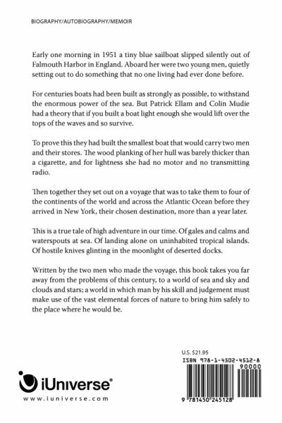 Early one morning in 1951 a tiny blue sailboat slipped silently out of Falmouth Harbor in England. Aboard her were two young men, quietly setting out to do something that no one living had ever done before. For centuries boats had been built as strongly as possible, to withstand the enormous power of the sea. But Patrick Ellam and Colin Mudie had a theory that if you built a boat light enough she would lift over the tops of the waves and so survive. To prove this they had built the smallest boat that would carry two men and their stores. The wood planking of her hull was barely thicker than a cigarette, and for lightness she had no motor and no transmitting radio. Then together they set out on a voyage that was to take them to four of the continents of the world and across the Atlantic Ocean before they arrived in New York, their chosen destination, more than a year later. This is a true tale of high adventure in our time. Of gales and calms and waterspouts at sea. Of landing alone on uninhabited tropical islands. Of hostile knives glinting in the moonlight of deserted docks. Written by the two men who made the voyage, this book takes you far away from the problems of this century, to a world of sea and sky and clouds and stars; a world in which man by his skill and judgement must make use of the vast elemental forces of nature to bring him safely to the place where he would be.