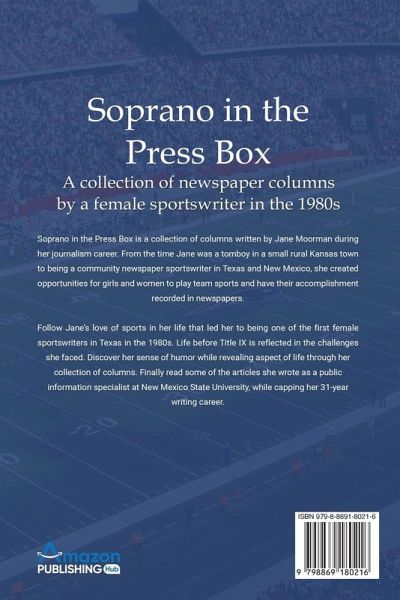 Soprano in the Press Box is a collection of columns written by Jane Moorman, during her journalism career. From the time Jane was a tomboy in a small rural Kansas town to being a community newspaper sportswriter in Texas and New Mexico, she created opportunities for girls and women to play team sports and have their accomplishment recorded in newspapers. Follow Jane's love of sports in her life that led her to being one of the first female sportswriters in Texas in the 1980s. Life before Title IX is reflected in the challenges she faced. Discover her sense of humor while revealing aspect of life through her collection of columns. Finally read some of the articles she wrote as a public information specialist at New Mexico State University, while capping her 31-year writing career.