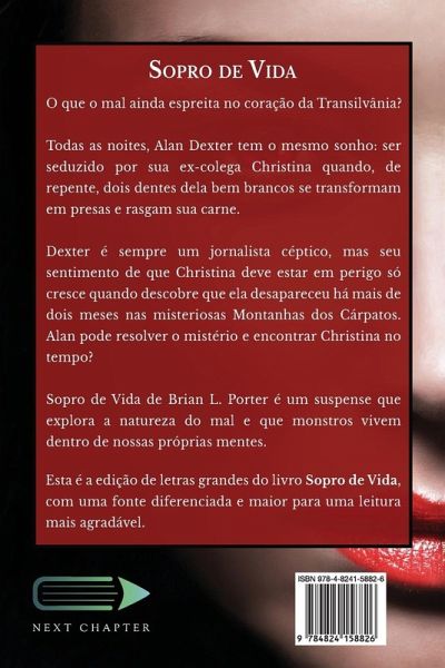 O que o mal ainda espreita no coração da Transilvânia? Todas as noites, Alan Dexter tem o mesmo sonho: ser seduzido por sua ex-colega Christina quando, de repente, dois dentes dela bem brancos se transformam em presas e rasgam sua carne. Dexter é sempre um jornalista céptico, mas seu sentimento de que Christina deve estar em perigo só cresce quando descobre que ela desapareceu há mais de dois meses nas misteriosas Montanhas dos Cárpatos. Alan pode resolver o mistério e encontrar Christina no tempo? Sopro de Vida de Brian L. Porter é um suspense que explora a natureza do mal e que monstros vivem dentro de nossas próprias mentes. Esta é a edição de letras grandes do livro Sopro de Vida, com uma fonte diferenciada e maior para uma leitura mais agradável.