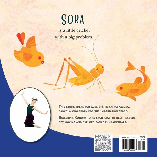 As the symphony floated above, Sora searched deep inside for a song. But nothing came. Melodies tickled across Sora's toes, legs, and back as the little cricket searched in vain for a song. Then a stern voice pierced the night, and the music stopped. "Someone's not singing." ¿¿¿Readers are invited to stretch, balance, jump, and move along with all the creatures in this delightful story of perseverance and celebrating your own unique voice. ¿¿Sora Searches for a Song is ideal for ages 5-8. It features Sora (no pronouns), birds, fish, frogs, dragonflies, turtles, snakes and more. Ballerina Konora joins each page with optional ideas to explore dance fundamentals. As kids move along with the characters and Ballerina Konora, they explore head/tail connection, dynamic posture, vestibular action, balance, movement quality, partnering, and more.