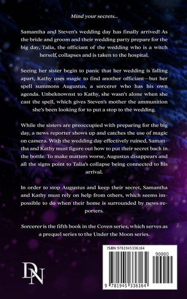 Mind your secrets... Samantha and Steven's wedding day has finally arrived! As the bride and groom and their wedding party prepare for the big day, Talia, the officiant of the wedding who is a witch herself, collapses and is taken to the hospital. Seeing her sister begin to panic that her wedding is falling apart, Kathy uses magic to find another officiant-but her spell summons Augustus, a sorcerer who has his own agenda. Unbeknownst to Kathy, she wasn't alone when she cast the spell, which gives Steven's mother the ammunition she's been looking for to put a stop to the wedding. While the sisters are preoccupied with preparing for the big day, a news reporter shows up and catches the use of magic on camera. With the wedding day effectively ruined, Samantha and Kathy must figure out how to put their secret back in the bottle. To make matters worse, Augustus disappears and all the signs point to Talia's collapse being connected to his arrival. In order to stop Augustus and keep their secret, Samantha and Kathy must rely on help from others, which seems impossible to do when their home is surrounded by news reporters. Sorcerer is the fifth book in the Coven series, which serves as a prequel series to the Under the Moon series.