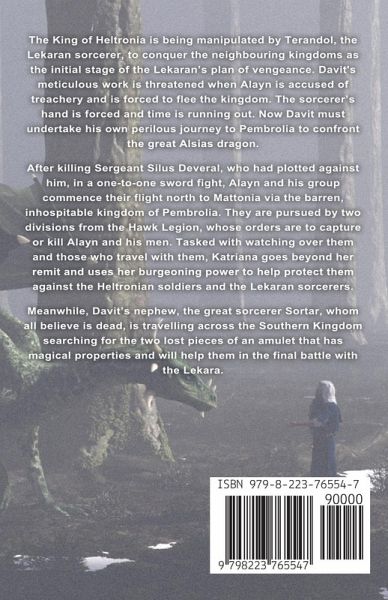 The King of Heltronia is being manipulated by Terandol, the Lekaran sorcerer, to conquer the neighbouring kingdoms as the initial stage of the Lekaran's plan of vengeance. Davit's meticulous work is threatened when Alayn is accused of treachery and is forced to flee the kingdom. The sorcerer's hand is forced and time is running out. Now Davit must undertake his own perilous journey to Pembrolia to confront the great Alsias dragon. After killing Sergeant Silus Deveral, who had plotted against him, in a one-to-one sword fight, Alayn and his group commence their flight north to Mattonia via the barren, inhospitable kingdom of Pembrolia. They are pursued by two divisions from the Hawk Legion, whose orders are to capture or kill Alayn and his men. Tasked with watching over them and those who travel with them, Katriana goes beyond her remit and uses her burgeoning power to help protect them against the Heltronian soldiers and the Lekaran sorcerers. Meanwhile, Davit's nephew, the great sorcerer Sortar, whom all believe is dead, is travelling across the Southern Kingdom searching for the two lost pieces of an amulet that has magical properties and will help them in the final battle with the Lekara.