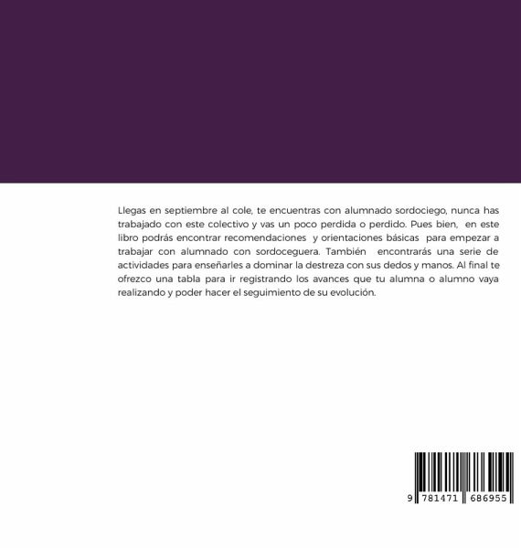 Llegas en septiembre al cole, te encuentras con alumnado sordociego, nunca has trabajado con este colectivo y vas un poco perdida o perdido. Pues bien, en este libro podrás encontrar recomendaciones y orientaciones básicas para empezar a trabajar con alumnado con sordoceguera. También encontrarás una serie de actividades para enseñarles a dominar la destreza con sus dedos y manos. Al final te ofrezco una tabla para ir registrando los avances que tu alumna o alumno vaya realizando y poder hacer el seguimiento de su evolución.