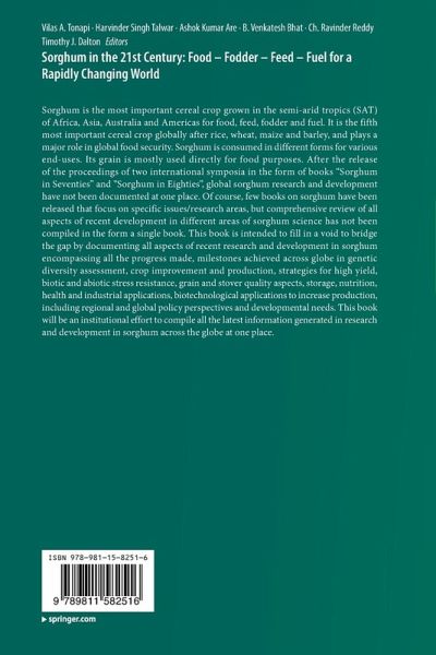 Sorghum is the most important cereal crop grown in the semi-arid tropics (SAT) of Africa, Asia, Australia and Americas for food, feed, fodder and fuel. It is the fifth most important cereal crop globally after rice, wheat, maize and barley, and plays a major role in global food security. Sorghum is consumed in different forms for various end-uses. Its grain is mostly used directly for food purposes. After the release of the proceedings of two international symposia in the form of books "Sorghum in Seventies" and "Sorghum in Eighties", global sorghum research and development have not been documented at one place. Of course, few books on sorghum have been released that focus on specific issues/research areas, but comprehensive review of all aspects of recent development in different areas of sorghum science has not been compiled in the form a single book. This book is intended to fill in a void to bridge the gap by documenting all aspects of recent research and development in sorghum encompassing all the progress made, milestones achieved across globe in genetic diversity assessment, crop improvement and production, strategies for high yield, biotic and abiotic stress resistance, grain and stover quality aspects, storage, nutrition, health and industrial applications, biotechnological applications to increase production, including regional and global policy perspectives and developmental needs. This book will be an institutional effort to compile all the latest information generated in research and development in sorghum across the globe at one place.