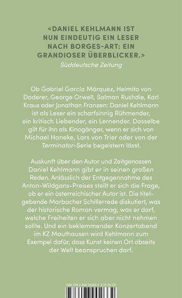 Auskunft über den Autor und Zeitgenossen Daniel Kehlmann gibt er in seinen großen Reden. Anlässlich der Entgegennahme des Anton-Wildgans-Preises stellt er sich die Frage, ob er ein österreichischer Autor ist. In der titelgebenden Marbacher Schillerrede denkt er über den historischen Roman nach. Und ein Konzert im KZ Mauthausen wird ihm zum Exempel dafür, dass Kunst keinen Ort abseits von der Welt beanspruchen darf.