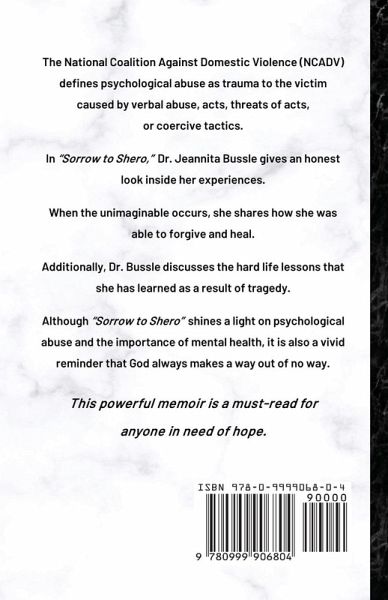 The National Coalition Against Domestic Violence (NCADV) defines psychological abuse as trauma to the victim caused by verbal abuse, acts, threats of acts, or coercive tactics.In "Sorrow to Shero," Dr. Jeannita Bussle gives an honest look inside her experiences.When the unimaginable occurs, she shares how she was able to forgive and heal.Additionally, Dr. Bussle discusses the hard life lessons she has learned as a result of tragedy.Although "Sorrow to Shero" shines a light on psychological abuse and the importance of mental health, it is also a vivid reminder that God always makes a way out of no way.
