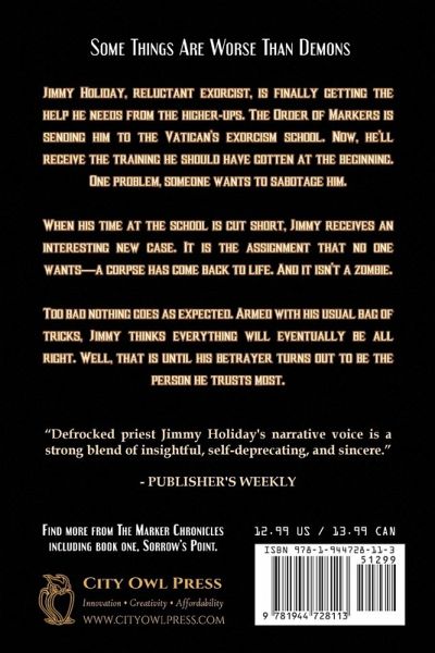 Some things are worse than demons. Jimmy Holiday, reluctant exorcist, is finally getting the help he needs from the higher-ups. The Order of Markers is sending him to the Vatican’s exorcism school. Now, he’ll receive the training he should have gotten at the beginning. One problem, someone wants to sabotage him. When his time at the school is cut short, Jimmy receives an interesting new case. It is the assignment that no one wants—a corpse has come back to life. And it isn’t a zombie. Too bad nothing goes as expected. Armed with his usual bag of tricks, Jimmy thinks everything will eventually be all right. Well, that is until his betrayer turns out to be the person he trusts most.