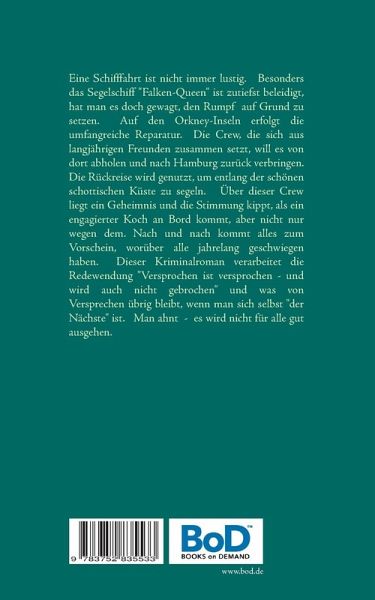 Eine Schifffahrt ist nicht immer lustig. Besonders das Segelschiff "Falken-Queen" ist zutiefst beleidigt, hat man es doch gewagt, den Rumpf auf Grund zu setzen. Auf den Orkney-Inseln erfolgt die umfangreiche Reparatur. Die Crew, die sich aus langjährigen Freunden zusammensetzt, will es von dort abholen und nach Hamburg zurück verbringen. Die Rückreise wird genutzt, um entlang der schönen schottischen Küste zu segeln. Über dieser Crew liegt ein Geheimnis und die Stimmung kippt, als ein engagierter Koch an Bord kommt, aber nicht nur wegen dem. Nach und nach kommt alles zum Vorschein, worüber alle jahrelang geschwiegen haben. Dieser Kriminalroman verarbeitet die Redewendung "Versprochen ist versprochen - und wird auch nicht gebrochen" und was von Versprechen übrig bleibt, wenn man sich selbst "der Nächste" ist. Man ahnt - es wird nicht für alle gut ausgehen.