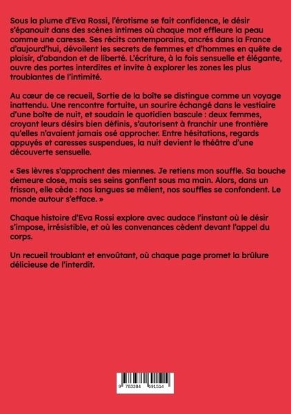 Sous la plume d'Eva Rossi, l'érotisme se fait confidence, le désir s'épanouit dans des scènes intimes où chaque mot effleure la peau comme une caresse. Ses récits contemporains, ancrés dans la France d'aujourd'hui, dévoilent les secrets de femmes et d'hommes en quête de plaisir, d'abandon et de liberté. L'écriture, à la fois sensuelle et élégante, ouvre des portes interdites et invite à explorer les zones les plus troublantes de l'intimité.Au coeur de ce recueil, Sortie de la boîte se distingue comme un voyage inattendu. Une rencontre fortuite, un sourire échangé dans le vestiaire d'une boîte de nuit, et soudain le quotidien bascule : deux femmes, croyant leurs désirs bien définis, s'autorisent à franchir une frontière qu'elles n'avaient jamais osé approcher. Entre hésitations, regards appuyés et caresses suspendues, la nuit devient le théâtre d'une découverte sensuelle.« Ses lèvres s'approchent des miennes. Je retiens mon souffle. Sa bouche demeure close, mais ses seins gonflentsous ma main. Alors, dans un frisson, elle cède : nos langues se mêlent, nos souffles se confondent. Le monde autour s'efface. »Chaque histoire d'Eva Rossi explore avec audace l'instant où le désir s'impose, irrésistible, et où les convenances cèdent devant l'appel du corps.Un recueil troublant et envoûtant, où chaque page promet la brûlure délicieuse de l'interdit.
