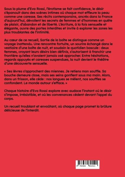 Sous la plume d'Eva Rossi, l'érotisme se fait confidence, le désir s'épanouit dans des scènes intimes où chaque mot effleure la peau comme une caresse. Ses récits contemporains, ancrés dans la France d'aujourd'hui, dévoilent les secrets de femmes et d'hommes en quête de plaisir, d'abandon et de liberté. L'écriture, à la fois sensuelle et élégante, ouvre des portes interdites et invite à explorer les zones les plus troublantes de l'intimité.Au coeur de ce recueil, Sortie de la boîte se distingue comme un voyage inattendu. Une rencontre fortuite, un sourire échangé dans le vestiaire d'une boîte de nuit, et soudain le quotidien bascule : deux femmes, croyant leurs désirs bien définis, s'autorisent à franchir une frontière qu'elles n'avaient jamais osé approcher. Entre hésitations, regards appuyés et caresses suspendues, la nuit devient le théâtre d'une découverte sensuelle.« Ses lèvres s'approchent des miennes. Je retiens mon souffle. Sa bouche demeure close, mais ses seins gonflentsous ma main. Alors, dans un frisson, elle cède : nos langues se mêlent, nos souffles se confondent. Le monde autour s'efface. »Chaque histoire d'Eva Rossi explore avec audace l'instant où le désir s'impose, irrésistible, et où les convenances cèdent devant l'appel du corps.Un recueil troublant et envoûtant, où chaque page promet la brûlure délicieuse de l'interdit.