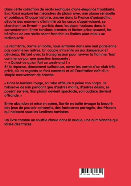 Dans cette collection de récits érotiques d'une élégance troublante, Eva Rossi explore les méandres du plaisir avec une plume sensuelle et poétique. Chaque histoire, ancrée dans la France d'aujourd'hui, dévoile des moments d'intimité où les corps s'apprivoisent, se cherchent, se livrent - parfois dans l'audace, toujours dans le consentement. Entre tensions latentes et lâcher-prise assumé, les héroïnes de ces récits osent franchir les limites pour mieux se redécouvrir.Le récit-titre, Sortie en boîte, nous entraîne dans une nuit parisienne pas comme les autres. Un couple s'invente un jeu dangereux et délicieux, flirtant avec la transgression pour raviver la flamme. Tout commence par une question innocente :- « Qu'est-ce qu'on fait ce week-end ? »Et la réponse, doucement sulfureuse, ouvre les portes d'un club très privé, où les regards se font caresses et où l'excitation naît d'un simple mouvement de hanche.« Dans la lumière rouge, sa robe effleure à peine son corps. Je l'observe deloin pendant que d'autres mains, d'autres désirs, se posent sur elle. Son plaisir devient spectacle, son audace devient offrande. »Entre abandon et mise en scène, Sortie en boîte évoque la beauté des jeux de pouvoir consentis, des fantasmes partagés, des frissons qui naissent sous les lumières tamisées.Un livre comme un souffle chaud dans la nuque, une nuit blanche qui laisse des traces.