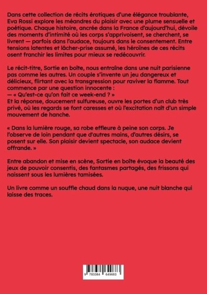 Dans cette collection de récits érotiques d'une élégance troublante, Eva Rossi explore les méandres du plaisir avec une plume sensuelle et poétique. Chaque histoire, ancrée dans la France d'aujourd'hui, dévoile des moments d'intimité où les corps s'apprivoisent, se cherchent, se livrent - parfois dans l'audace, toujours dans le consentement. Entre tensions latentes et lâcher-prise assumé, les héroïnes de ces récits osent franchir les limites pour mieux se redécouvrir.Le récit-titre, Sortie en boîte, nous entraîne dans une nuit parisienne pas comme les autres. Un couple s'invente un jeu dangereux et délicieux, flirtant avec la transgression pour raviver la flamme. Tout commence par une question innocente :- « Qu'est-ce qu'on fait ce week-end ? »Et la réponse, doucement sulfureuse, ouvre les portes d'un club très privé, où les regards se font caresses et où l'excitation naît d'un simple mouvement de hanche.« Dans la lumière rouge, sa robe effleure à peine son corps. Je l'observe deloin pendant que d'autres mains, d'autres désirs, se posent sur elle. Son plaisir devient spectacle, son audace devient offrande. »Entre abandon et mise en scène, Sortie en boîte évoque la beauté des jeux de pouvoir consentis, des fantasmes partagés, des frissons qui naissent sous les lumières tamisées.Un livre comme un souffle chaud dans la nuque, une nuit blanche qui laisse des traces.