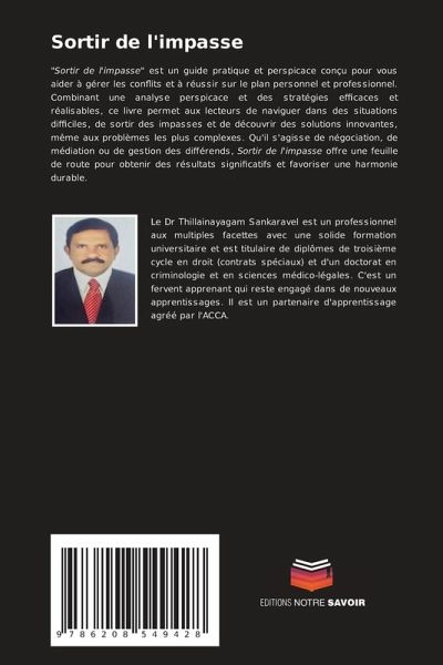"Sortir de l'impasse" est un guide pratique et perspicace conçu pour vous aider à gérer les conflits et à réussir sur le plan personnel et professionnel. Combinant une analyse perspicace et des stratégies efficaces et réalisables, ce livre permet aux lecteurs de naviguer dans des situations difficiles, de sortir des impasses et de découvrir des solutions innovantes, même aux problèmes les plus complexes. Qu'il s'agisse de négociation, de médiation ou de gestion des différends, Sortir de l'impasse offre une feuille de route pour obtenir des résultats significatifs et favoriser une harmonie durable.