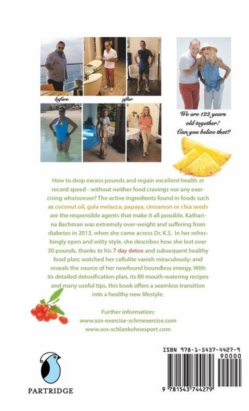 German globetrotter Katharina Bachman was extremely overweight and suffering from diabetes when she walked into an Indian doctors Kuala Lumpur practice in 2013, desperate for help. After Dr. K.S. prescribed a seven-day detoxification plan and subsequent transformative tropical power-food diet, Bachmans excess pounds melted away at record speed, her diabetes disappeared, and her blood pressure stabilized. Even her loathsome cellulite vanished. In a candid and witty personal account, Bachman shares her own success story as well as valuable insight on how to drop excess pounds and quickly regain a healthy life without craving food or incorporating exercise into a daily routine. Through a highly effective, detailed detoxification plan that includes eighty mouthwatering recipes and useful tips, others will learn how to balance metabolism while feasting on tropical culinary delights that rely on active ingredients such as coconut oil, gula melaka, papaya, cinnamon, and chia seeds to assist in the weight loss process. SOS Exercise-Schmexercise offers proven tips, time-tested advice, and delicious recipes created to help anyone wishing to balance metabolism, lose weight, shed medications, and attain a healthy lifestyle.