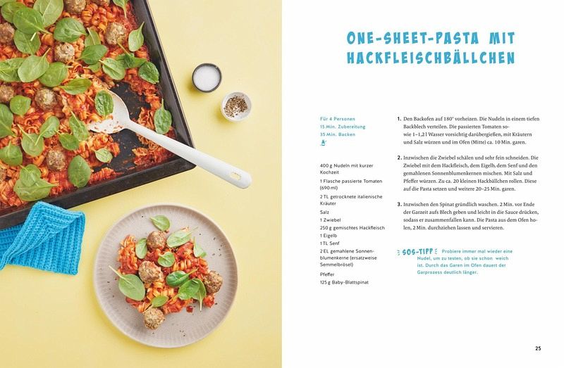 Das Buch beginnt mit den gerade dem Zeitgeist entsprechenden One-Pot-Gerichten, die auf mich manchmal etwa bemüht wirken, wie zB die One-Sheet-Pasta mit Hackfleischbällchen, die komplett auf einem Backblech zubereitet wird. Nudeln auf einem Blech gar zu bekommen, wäre mir doch zu umständlich, da spüle ich im Anschluss lieber einen zusätzlichen Topf.