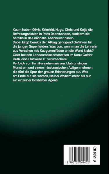 Kaum haben Olivia, Krimhild, Hugo, Chris und Kolja die Befreiungsaktion in Paris überstanden, stolpern sie bereits in das nächste Abenteuer hinein.Dabei birgt bereits der Alltag genügend Gefahren für die jungen Superhelden. Was tun, wenn man die Lehrerin aus Versehen mit Kaugummifäden an die Wand klebt? Oder bei den Landesmeisterschaften im Kanu Gefahr läuft, eine Flutwelle zu verursachen?Verfolgt von Familiengeheimnissen, blutrünstigen Monstern und einem misstrauischen Adligen nehmen die fünf die Spur der grauen Erinnerungen auf. Was am Ende auf sie wartet, ist bei Weitem mehr als nur ein einzelner boshafter Agent.Band 2 der SOS-Superhelden - das Abenteuer geht weiter! Ein Buch zum Mitfiebern, Mitlachen und Sich-selbst-Superkräfte-wünschen.