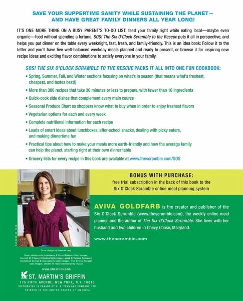 Dinner with kids shouldn't be a battleground. And it shouldn't make a martyr out of the parent whose job it is to get it on the table fast, fresh and hot every day at 6 PM. Aviva Goldfarb's cheerful Scramble system takes the hassle and worry out of mealtime. Her users and readers rely on her grocery lists, weekly meal plans and recipes not just for the healthy dinners themselves but for taking the stress out of dinnertime. She wants families to actually enjoy their dinners together! Now, with SOS! The Six O'Clock Scramble to the Rescue, Goldfarb is taking an extra of-the-moment stress away from meal planning for busy families: concern about the environment, about the cost of shipping out-of-season food halfway around the world, about packaging, about additives and preservatives. In SOS! The Six O'Clock Scramble to the Rescue, readers will get a full year of weekly meals that: --help readers eat seasonally without missing their favorite foods --move toward a slightly more vegetarian menu for health and a lighter environmental footprint --reveal when organic matters (and when it doesn't) --save money through easy, efficient planning, bulk buying, freezing and storing, and avoiding waste --pack the power of achievable ethnic meals, such as Easy Cheesy Tex Mex Scramble and Greek Pasta Salad --make grocery trips count