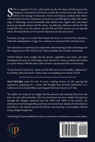 SOS is a sequel to S.I.C.Q., which picks up after the alien, ADAM, projects his hologram in thousands of locations around the world and on the Moon and delivers his message to humanity. Tsirch and Richard, combine their efforts with Domestic Security Command, secret service and FBI agents as they take center stage in thwarting several potentially fatal attacks from Seger8 and Anti-Adam factions to stop all contact with the aliens. An elaborate scheme to destroy the Hat Creek SETI site is set into motion and the FBI and SETI security race to stop the attack. Personal attacks on two pivotal characters are also uncovered. Romantic pairings are revealed that deepen the focus on several of the characters, while also making them a target. Eve continues to document the evolving events. New characters are introduced to expand the understanding of alien technology and the reappearance of the reclusive Dr. 'Gemo solidifies the scientific community. ADAM delivers more insight into his species' capabilities and intent, and their standing in the universe. Dominique, Amir, Sal and Dr. 'Gemo, combine their efforts in a joint venture with the aliens, that can have a permanent effect on humanity. Tsirch, Richard, Sal and Dr. 'Gemo and the full cast yet await another, "appearance" by ADAM, while Sal and Dr. 'Gemo chew on unsettling news about ADAM.