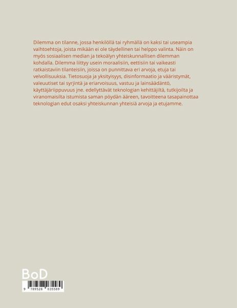 Dilemma on tilanne, jossa henkilöllä tai ryhmällä on kaksi tai useampia vaihtoehtoja, joista mikään ei ole täydellinen tai helppo valinta. Näin on myös sosiaalisen median ja tekoälyn yhteiskunnallisen dilemman kohdalla. Dilemma liittyy usein moraalisiin, eettisiin tai vaikeasti ratkaistaviin tilanteisiin, joissa on punnittava eri arvoja, etuja tai velvollisuuksia. Tietosuoja ja yksityisyys, disinformaatio ja vääristymät, valeuutiset tai syrjintä ja eriarvoisuus, vastuu ja lainsäädäntö, käyttäjäriippuvuus jne. edellyttävät teknologian kehittäjiltä, tutkijoilta ja viranomaisilta istumista saman…mehr