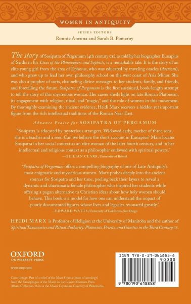 The story of Sosipatra of Pergamum (4th century C.E.) as told by her biographer, Eunapius of Sardis in his Lives of the Philosophers and Sophists, is a remarkable tale. It is the story of an elite young girl from the area of Ephesus, who was educated by traveling oracles (daemons), and who grew up to lead her own philosophy school on the west coast of Asia Minor. She was also a prophet of sorts, channeling divine messages to her students, family, and friends, and foretelling the future. Sosipatra of Pergamum is the first sustained, book length attempt to tell the story of this mysterious woman. It presents a rich contextualization of the brief and highly fictionalized portrait provided by Eunapius. In doing so, the book explores the cultural and political landscape of late ancient Asia Minor, especially the areas around Ephesus, Pergamum, Sardis, and Smyrna. It also discusses moments in Sosipatra's life for what they reveal more generally about women's lives in Late Antiquity in the areas of childhood, education, family, household, motherhood, widowhood, and professional life. Her career sheds light on late Roman Platonism, its engagement with religion, ritual, and "magic," and the role of women in this movement. By thoroughly examining the ancient evidence, Heidi Marx recovers a hidden yet important figure from the rich intellectual traditions of the Roman Near East.