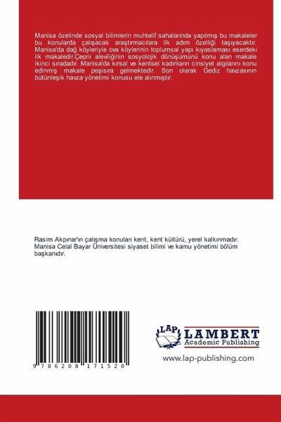 Manisa özelinde sosyal bilimlerin muhtelif sahalar¿nda yap¿lm¿¿ bu makaleler bu konularda çal¿¿acak arät¿rmac¿lara ilk ad¿m özelli¿i tä¿yacakt¿r. Manisa'da dä köyleriyle ova köylerinin toplumsal yap¿ k¿yaslamas¿ eserdeki ilk makaledir.Çepni alevili¿inin sosyolojik dönü¿ümünü konu alan makale ikinci s¿radad¿r. Manisa'da k¿rsal ve kentsel kad¿nlar¿n cinsiyet alg¿lar¿n¿ konu edinmi¿ makale pe¿is¿ra gelmektedir. Son olarak Gediz havzas¿n¿n bütünle¿ik havza yönetimi konusu ele al¿nm¿¿t¿r.