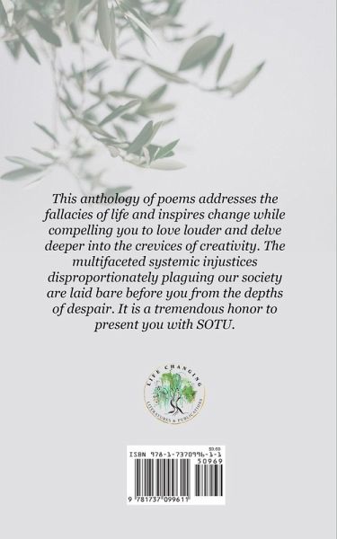 "This anthology of poems addresses the fallacies of life and inspires change while compelling you to love louder and delve deeper into the crevices of creativity. The multifaceted systemic injustices disproportionately plaguing our society are laid bare before you from the depths of despair. It is a tremendous honor to present you with SOTU."