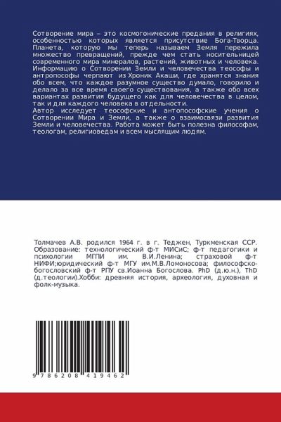 Sotworenie mira - äto kosmogonicheskie predaniq w religiqh, osobennost'ü kotoryh qwlqetsq prisutstwie Boga-Tworca. Planeta, kotoruü my teper' nazywaem Zemlq perezhila mnozhestwo prewraschenij, prezhde chem stat' nositel'nicej sowremennogo mira mineralow, rastenij, zhiwotnyh i cheloweka. Informaciü o Sotworenii Zemli i chelowechestwa teosofy i antroposofy cherpaüt iz Hronik Akashi, gde hranqtsq znaniq obo wsem, chto kazhdoe razumnoe suschestwo dumalo, goworilo i delalo za wse wremq swoego suschestwowaniq, a takzhe obo wseh wariantah razwitiq buduschego kak dlq chelowechestwa w celom, tak i dlq kazhdogo cheloweka w otdel'nosti.Awtor issleduet teosofskie i antoposofskie ucheniq o Sotworenii Mira i Zemli, a takzhe o wzaimoswqzi razwitiq Zemli i chelowechestwa. Rabota mozhet byt' polezna filosofam, teologam, religiowedam i wsem myslqschim lüdqm.