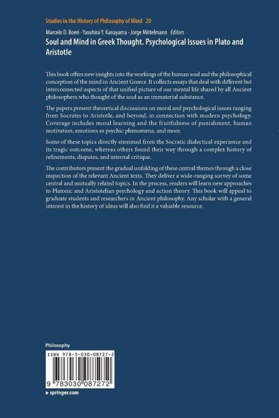 Chapter 1. General Introduction (Marcelo D. Boeri).- Part I. Plato.- Chapter 2. The Beauty and the Beast: Tragedy and Dialog in Plato's Philosophy (Barbara Botter).- Chapter 3. Socrates on Punishment and the Law: Apology 25c5-26b2 (Thomas Brickhouse).- Chapter 4. Why didn't Socrates Escape? (Mariko Kanayama).- Chapter 5. Plato's Wax Tablet (Yasuhira Y. Kanayama).- Chapter 6. Politics of the Soul in Plato's Republic (Iván De los Ríos).- Part II. Plato, Aristotle, and Commentators on Aristotle.- Chapter 7. Platonic Souls in the Cave: Can they be just Rational? (Ivana Costa).- Chapter 8. Plato and Aristotle on what is Common to Body and Soul. Some Remarks on a Complicated Issue (Marcelo D. Boeri).- Chapter 9. The Causal Structure of Emotions in Aristotle: Hylomorphism, Causal Interaction Between Mind and Body, and Intentionality (Gabriela Rossi).- Chapter 10. Dissimilarity Between Moral Excellence and Art: An Interpretation of Aristotle's Nicomachean Ethics II 4 (Javier Echeñique).- Chapter 11. To Be Handled with Care: Alexander on Nature as a Passive Power (Jorge Mittelmann).- Chapter 12. The Notion of Human Soul in Themistius (Manuel Correia).