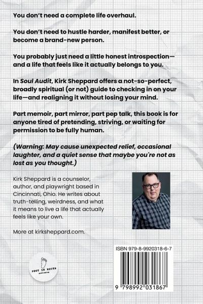 Soul Audit: A Not-So-Perfect, Broadly Spiritual (Or Not) Guide to Aligning Your Life is a funny, honest, and deeply human exploration of what it means to live in alignment with your soul-even when life is messy, imperfect, and not at all what you expected. Blending storytelling, therapeutic insight, and humor, licensed therapist and writer Kirk Sheppard invites readers to stop chasing perfection and start paying attention to the real signs of growth: less hiding, fewer emotional spirals, and more moments of quiet joy. With warmth and irreverence, he walks alongside readers through the messy middle of adulthood, offering reflections on identity, shame, grief, time, spirituality, friendship, the body, and work. Through relatable client stories (fictionalized for confidentiality), personal anecdotes, and practical soul audit exercises, Sheppard shows that alignment isn't about becoming a polished, idealized version of yourself-it's about building a life that feels like your own. One honest choice at a time. Written for anyone who has ever felt out of step with their own life, Soul Audit is an invitation to get curious about where you're living out of alignment-and to start making small, realigned choices without judgment or perfectionism. It's not a manual for self-optimization. It's a reminder that authenticity matters more than image, and that living well is less about being impressive and more about being present. Whether you're wrestling with anger, rebuilding your relationship with your body, grieving what could have been, or rediscovering joy in unexpected places, this book offers a compassionate, funny, and practical guide to coming home to yourself-probably. For fans of Brené Brown, Glennon Doyle, Mel Robbins, and anyone who prefers their self-help with a side of humor, Soul Audit is a new kind of roadmap: imperfect, practical, and fiercely kind.