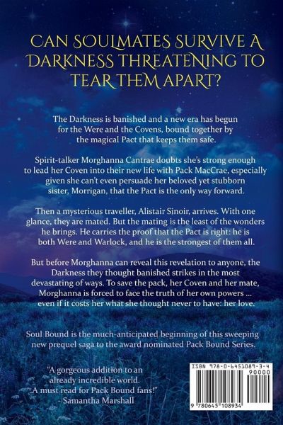 Can soulmates survive a darkness threatening to tear them apart? The Darkness is banished and a new era has begun for the Were and the Covens, bound together by the magical Pact that keeps them safe. Spirit-talker Morghanna Cantrae doubts she's strong enough to lead her Coven into their new life with Pack MacCrae, especially given she can't even persuade her beloved yet stubborn sister, Morrigan, that the Pact is the only way forward. Then a mysterious traveller, Alistair Sinoir, arrives. With one glance, they are mated. But the mating is the least of the wonders he brings. He carries the proof that the Pact is right: he is both Were and Warlock, and he is the strongest of them all. But before Morghanna can reveal this revelation to anyone, the Darkness they thought banished strikes in the most devastating of ways. To save the pack, her Coven and her mate, Morghanna is forced to face the truth of her own powers ... even if it costs her what she thought never to have: her love. Set 500 years ago, Soul Bound is book 1 of the Dawn of the Curse Series, the much-anticipated start of a sweeping new prequel saga in the award nominated Pack Bound Series. "Wow what a start. This book was magical and captivating throughout. Thoroughly enjoyed the storyline and characters and how they overcome things." Pat's Reviews - Goodreads and BookSprout Reviewer "I loved this! ... I loved reading about the history and what happened to set things in motion. This is a very good book and is most definitely worth reading." A Schofield - Goodreads, BookBub and BookSprout Reviewer "Great Start to the Prequel Series ... Beautifully written and moving ... I look forward to reading the next one." N Parker - Goodreads and BookSprout Reviewer "This is so good! I found myself swept away in this magical and captivating story as we meet Morghanna & Alistair and the start of their journey together ... I'm hooked and so looking forward to the next book." Debbie Eyre - Goodreads, BookBub and BookSprout Reviewer If stories of wild magic, shifters, witches, fated mates, terrible secrets, meddling Goddesses and the struggle against evil, all mixed with a large dollop of sexy romance are your idea of story heaven, then this is the book for you. Start your journey into the Dawn of the Curse Series and discover the long-forgotten secrets of the ancient witches and shifters by binding yourself to a copy of Soul Bound today.