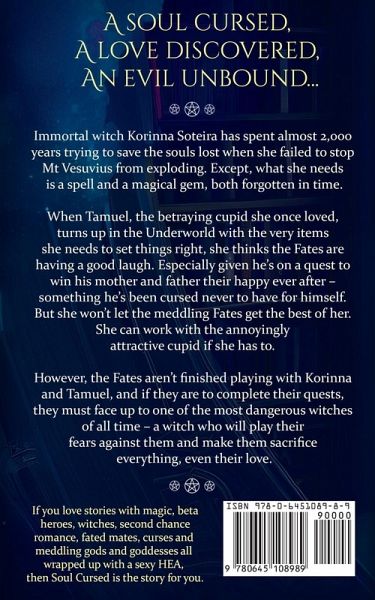A soul cursed, a love discovered, an evil unbound ... Immortal witch Korinna Soteira has spent almost 2,000 years trying to save the souls lost when she failed to stop Mt Vesuvius from exploding. Except, what she needs is a spell and a magical gem, both forgotten in time. When Tamuel, the betraying cupid she once loved, turns up in the Underworld with the very items she needs to set things right, she thinks the Fates are having a good laugh. Especially given he's on a quest to win his mother and father their happy ever after - something he's been cursed never to have for himself. But she won't let the meddling Fates get the best of her. She can work with the annoyingly attractive cupid if she has to. However, the Fates aren't finished playing with Korinna and Tamuel, and if they are to complete their quests, they must face up to one of the most dangerous witches of all time - a witch who will play their fears against them and make them sacrifice everything, even their love. If you love stories with magic, beta heroes, witches, second chance romance, fated mates, curses and meddling gods and goddesses all wrapped up with a sexy HEA, then Soul Cursed is the story for you. Discover the magic of the Gods Cursed Series and download your copy today.