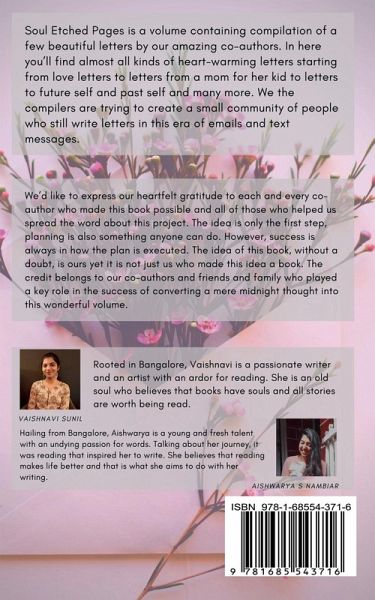 Soul Etched Pages is a volume containing a compilation of a few beautiful letters by our amazing co-authors. In here you'll find almost all kinds of heart-warming letters starting from love letters to letters from a mom for her kid to letters to future self and past self and many more. We the compilers are trying to create a small community of people who still write letters in this era of emails and text messages.