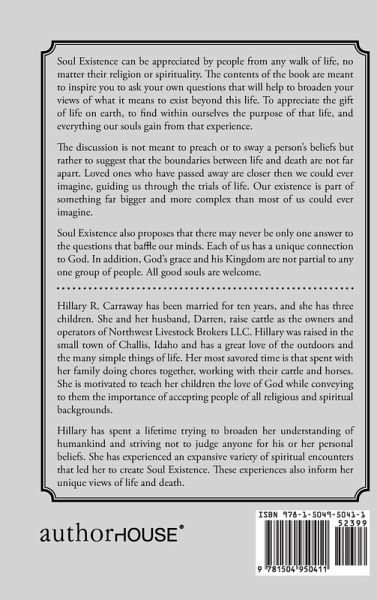 Soul Existence can be appreciated by people from any walk of life, no matter their religion or spirituality. The contents of the book are meant to inspire you to ask your own questions that will help to broaden your views of what it means to exist beyond this life. To appreciate the gift of life on earth, to find within ourselves the purpose of that life, and everything our souls gain from that experience. The discussion is not meant to preach or to sway a person's beliefs but rather to suggest that the boundaries between life and death are not far apart. Loved ones who have passed away are closer then we could ever imagine, guiding us through the trials of life. Our existence is part of something far bigger and more complex than most of us could ever imagine. Soul Existence also proposes that there may never be only one answer to the questions that baffle our minds. Each of us has a unique connection to God. In addition, God's grace and his Kingdom are not partial to any one group of people. All good souls are welcome.