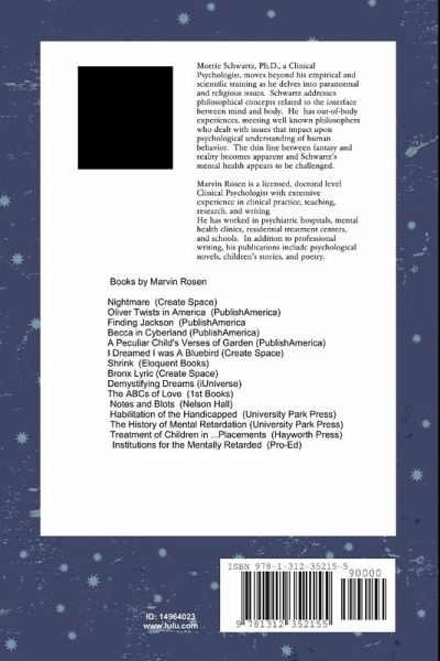 A Clinical Psychologist explores the mind-body problem. His out-of-body experiences include time travel to the past. He encounbters Maimonides, Spinoza, Einstein, and Freud. He addresses issues of soul, afterlife, and mysticism. The thin line between fantasy and reality become apparent and his mental appears questionable.