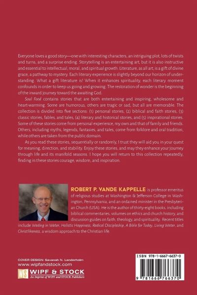 Everyone loves a good story--one with interesting characters, an intriguing plot, lots of twists and turns, and a surprise ending. Storytelling is an entertaining art, but it is also instructive and essential to intellectual, moral, and spiritual growth. Literature, as all art, is a gift of divine grace, a pathway to mystery. Each literary experience is slightly beyond our horizon of understanding. What a gift literature is! When it enhances spirituality, each literary moment confounds in order to keep us going and growing. The restoration of wonder is the beginning of the inward journey toward the awaiting God. Soul Food contains stories that are both entertaining and inspiring, wholesome and heart-warming. Some are humorous, others are tragic or sad, but all are memorable. The collection is divided into five sections: (1) personal stories, (2) biblical and faith stories, (3) classic stories, fables, and tales, (4) literary and historical stories, and (5) inspirational stories. Some of these stories come from personal experience, my own and that of family and friends. Others, including myths, legends, fantasies, and tales, come from folklore and oral tradition, while others are taken from the public domain. As you read these stories, sequentially or randomly, I trust they will aid you in your quest for meaning, direction, and stability. Enjoy these stories, and may they enhance your journey through life and its manifold seasons. I hope you will return to this collection repeatedly, finding in these stories courage, wisdom, and inspiration.