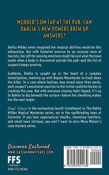 Murder's on tap at the pub. Can Dahlia's new powers brew up answers? Dahlia Wildes never imagined her magical abilities would be this exhausting. But with Eastwind overrun by an unusual wave of tourists, her gift for sensing emotions might be just what the town needs when a body is discovered outside the pub-and the list of suspects keeps growing. Suddenly, Dahlia is caught up in the heart of a complex investigation, teaming up with Deputy Manchester to track down the killer. In a case where feelings may reveal more than words, each suspect's emotional reaction to the victim could be the key to cracking the case. But with everyone staying tight-lipped, it's up to Dahlia to dig beneath the surface-before her sleuthing makes her the next target. Soul Glaze is the enchanting fourth installment in The Dahlia Wildes Magical Mysteries series, set in the spellbinding town of Eastwind. If you love supernatural sleuths, charming familiars, and small-town intrigue, you won't want to miss Nova Nelson's cozy mystery series. Buy Soul Glaze today and uncover the secrets brewing in Eastwind!