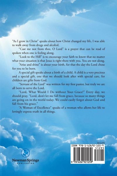 "As I grow in Christ" speaks about how Christ changed my life, I was able to walk away from drugs and alcohol. "Cast me not from thee, O Lord" is a prayer that can be read of spoken when one is feeling along. "Look to the Hill" is to encourage your faith to know that no matter what your situation is that Jesus is right there with you. You are not along. "Arise and shine" is about your birth, for that the day the Lord chose for you to be born. A special gift speaks about a birth of a child. A child is a very precious and a special gift, one that we should look after with special care, for children are gifts from God. "Servant of the Lord" was written for my first pastor, but truly we are all born to serve the Lord. "Lord, What Would I Do without Your Grace?" Every day, we should pray, "Lord, don't let me fall from grace, because so many things are going on in the world today. We could easily forget about God and fall from his grace." "A Woman of Excellence" speaks of a woman who allows her life to lovingly express truth in all things.