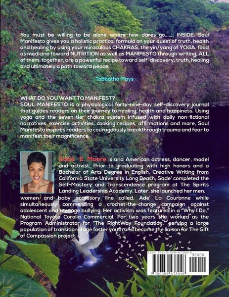 Soul Manifesto is a physiological 49 day journey that guides readers on their quest to healing, health and happiness. Using yoga and the seven-tier chakra system infused with daily non-fictional narratives, exercise activities, cooking recipes, affirmations and more, Soul Manifesto inspires readers to courageously breakthrough trauma and fear to manifest their magnificence.
