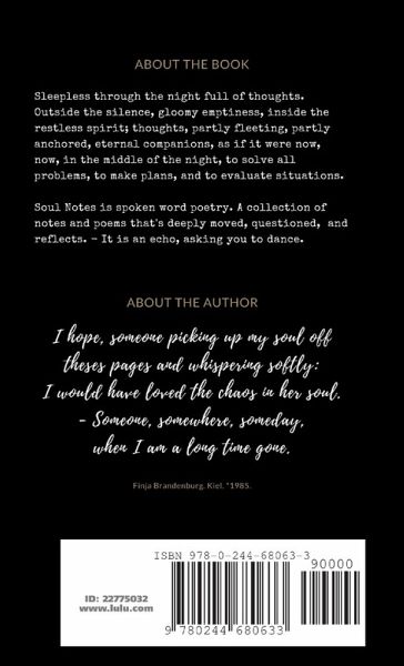 Sleepless through the night, full of thoughts. Outside the silence, gloomy emptiness, inside the restless spirit; thoughts, partly fleeting, partly anchored, eternal companions, as if it were now, right now, in the middle of the night, to solve all problems, to make plans, and to evaluate situations. Soul Notes is spoken word poetry. A collection of notes and poetry about love, pain, doubts, laughing, development and chaos. Sometimes, a note expresses more than 100 words - a note that's deeply moved, scrutinized, and reflects. Soul Notes is an echo, asking you to dance.