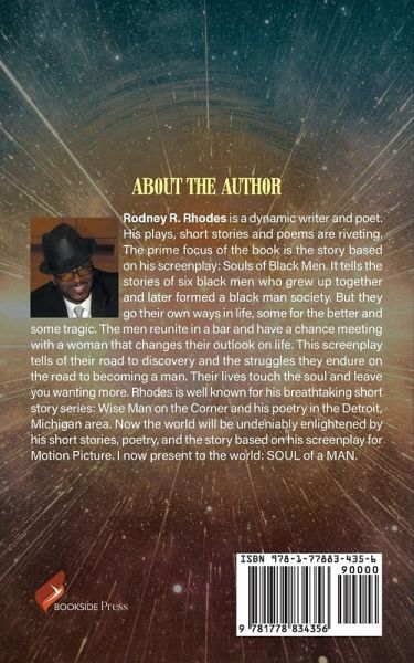 Rodney R. Rhodes is a dynamic writer and poet. His plays, short stories and poems are riveting. The prime focus of the book is the story based on his screenplay: Souls of Black Men. It tells the stories of six black men who grew up together and later formed a black man society. But they go their own ways in life, some for the better and some tragic. The men reunite in a bar and have a chance meeting with a woman that changes their outlook on life. This screenplay tells of their road to discovery and the struggles they endure on the road to becoming a man. Their lives touch the soul and leave you wanting more. Rhodes is well known for his breathtaking short story series: Wise Man on the Corner and his poetry in the Detroit, Michigan area. Now the world will be undeniably enlightened by his short stories, poetry, and the story based on his screenplay for Motion Picture. I now present to the world: SOUL of a MAN.