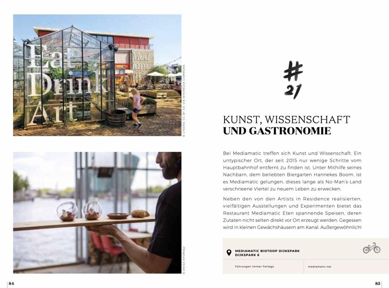 Ein Spaziergang durch die Gemeinschaftsgärten im Westerpark , die beste Appeltaart im Jordaan, eine Übernachtung mitten in einer Gracht, eine kleine Verschnaufpause in einem braunen Café, schmackhaftes Craftbeer im Schatten einer Mühle, Kopfsprung ins kühle Nass der Amstel, Gaumenfreuden in den besten Restaurants der Stadt oder nachhaltig dort schlafen, wo einst Ozeanriesen ablegten ...