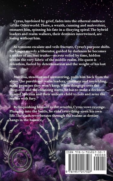 Cyrus, burdened by grief, fades into the ethereal embrace of the Otherworld. There, a wraith, cunning and malevolent, ensnares him, spinning his fate in a dizzying spiral. The hybrid leaders and realm walkers, their destinies intertwined, are losing without him. As tensions escalate and veils fracture, Cyrus's purpose shifts. No longer merely a liberator, guided by darkness he becomes a seeker of ancient truths-secrets veiled by time, hidden within the very fabric of the middle realm. His quest is relentless, fueled by determination and the weight of his lost love. Marilisa, steadfast and unwavering, pulls him back from the abyss. The pureblood realm leaders, obstinate and unyielding, make promises they won't keep. When things go over the deep-end and the cleansing starts, he has to make a decision to send Marilisa and their unborn child to Lols and seize the realms with fury. Relinquishing himself to the wraiths, Cyrus vows revenge. Plunging into the battle, he risks everything-even his own life. The clash reverberates through the realms as destiny hangs in the balance.