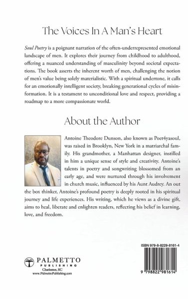Soul Poetry: The Voices in a Man's Heart is a powerful exploration of the male condition. This book is a sincere effort to give a voice to men, who often struggle to express their feelings and emotions during various phases of life. From the innocence of childhood to the responsibilities of fatherhood, this book delves into the complexities of masculine experiences. It's an expose of the silent struggles that men endure, from living a day-to-day life, to the challenges of growing up without a father figure. This engaging narrative provides a fresh perspective on what it means to be a man and the misconceptions that surround this identity. Infused with spirituality, the book also explores the love of God and the profound emotions that can be experienced in reciprocating that love. It addresses the societal expectations placed upon men to be providers, challenging the belief that men's worth is determined solely by what they can offer materially. The book asserts that men, like women and children, have an intrinsic value bestowed upon them by the divine. The book is also a clarion call for breaking the cycle of negative perceptions and misinformation passed down through generations, which has led to a multitude of societal issues. It advocates for fostering a more emotionally intelligent society, which can build stronger families, communities, and a better future for the next generation. Soul Poetry is a heartwarming testament of unconditional love, a beacon of hope for those navigating the path of manhood. It offers understanding, compassion, and a clear vision of how acknowledging and respecting the emotional lives of men can pave the way for a more enlightened and harmonious society. In reading this book, you'll find an echo of the author's unconditional love, a testament to his belief in the potential of every individual to make a positive impact. This is not just a book, but a journey of self-discovery, a roadmap to a more compassionate world.