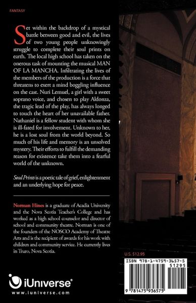 Set within the backdrop of a mystical battle between good and evil, the lives of two young people unknowingly struggle to complete their soul prints on earth. The local high school has taken on the onerous task of mounting the musical MAN OF LA MANCHA. Infiltrating the lives of the members of the production is a force that threatens to exert a mind boggling influence on the cast. Nuri Lemuel, a girl with a sweet soprano voice, and chosen to play Aldonza, the tragic lead of the play, has always longed to touch the heart of her unavailable father. Nathaniel is a fellow student with whom she is ill-fated for involvement. Unknown to her, he is a lost soul from the world beyond. So much of his life and memory is an unsolved mystery. Their efforts to fulfill the demanding reason for existence take them into a fearful world of the unknown. Soul Prints is a poetic tale of grief, enlightenment and an underlying hope for peace.