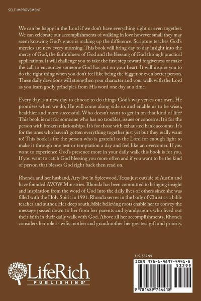 We can be happy in the Lord if we don't have everything right or even together. We can celebrate our accomplishments of walking in love however small they may seem knowing God's grace is making up the difference. Scripture teaches God's mercies are new every morning. This book will bring day to day insight into the mercy of God, the faithfulness of God and the blessing of God through practical applications. It will challenge you to take the first step toward forgiveness or make the call to encourage someone God has put on your heart. It will inspire you to do the right thing when you don't feel like being the bigger or even better person. These daily devotions will strengthen your character and your walk with the Lord as you learn godly principles from His word one day at a time. Every day is a new day to choose to do things God's way verses our own. He promises when we do, He will come along side us and enable us to be wiser, healthier and more successful. Who doesn't want to get in on that kind of life? This book is not for someone who has no troubles, issues or concerns. It's for the person with broken relationships. It's for those with exhausted bank accounts. It's for the ones who haven't gotten everything together just yet but they really want to! This book is for the person who is grateful to the Lord for enough light to make it through one test or temptation a day and feel like an overcomer. If you want to experience God's presence more in your daily walk this book is for you. If you want to catch God blessing you more often and if you want to be the kind of person that blesses God right back then read on.