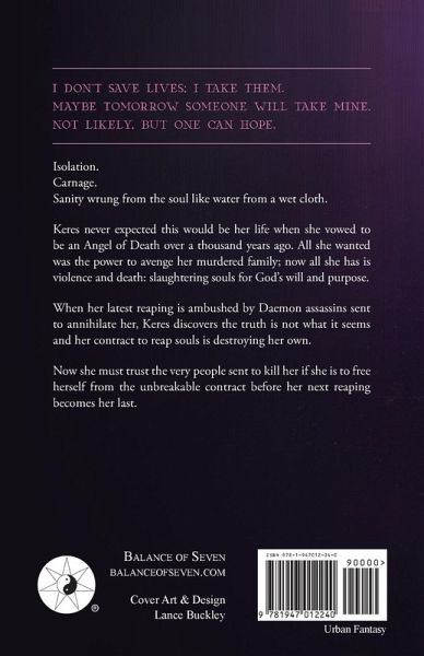 I don't save lives; I take them. Maybe tomorrow someone will take mine. Not likely, but one can hope. Isolation. Carnage. Sanity wrung from the soul like water from a wet cloth. Keres never expected this would be her life when she vowed to be an Angel of Death over a thousand years ago. All she wanted was the power to avenge her murdered family; now all she has is violence and death: slaughtering souls for God's will and purpose. When her latest reaping is ambushed by Daemon assassins sent to annihilate her, Keres discovers the truth is not what it seems and her contract to reap souls is destroying her own. Now she must trust the very people sent to kill her if she is to free herself from the unbreakable contract before her next reaping becomes her last.