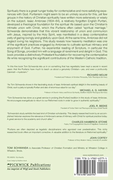 Spiritually there is a great hunger today for contemplative and more satisfying experiences with God. Puritanism might seem to be an unlikely source for this, yet few groups in the history of Christian spirituality have written more extensively or wisely on the subject. Isaac Ambrose (1604-64), a relatively forgotten English Puritan, developed a theological foundation for the spiritual life based upon the Christian's intimate union with Christ, which the Puritans often called "spiritual marriage." Schwanda demonstrates that this vibrant relationship of union and communion with Jesus, inspired by the Holy Spirit, was manifested in a deep contemplative piety of gazing lovingly and gratefully upon God. At the same time, Ambrose did not neglect loving his neighbors. This study reveals how heavenly meditation was one of the significant practices engaged by Ambrose to cultivate spiritual intimacy and enjoyment of God. Further, his experiential reading of Scripture, in particular the Song of Songs, provided him with a language of ravishment and delight in God. This book provides a distinctively Protestant foundation for recovering the contemplative life while recognizing the significant contributions of the Western Catholic tradition.